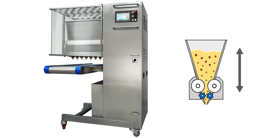 • Opcionális kiegészítő egység a sütemények díszítésére az adagoló- és formázószerkezet emelésével és leengedésével a szállítószalag leállításakor