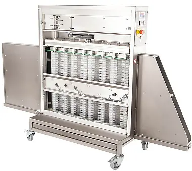 MECH-MASZ által gyártott professzionális sütő- és cukrászati tálca tisztító tökéletesen alkalmazhatóak az iparban használt leggyakoribb tálcaméretekkel: 400 x 600 mm, 580 x 780 mm, 600 x 800 mm, 6000 x 1000 mm és az összes köztes változat.. A készülék sima és perforált tálcákkal egyaránt használható, amelyek különböző anyagokból készülnek, például rozsdamentes acélból, alumíniumból, fekete acélból. A beprogramozott ciklusszámmal (egy tálca áthaladása a kefék között), max. 20, lehetőség van a gép működési módjának beállítására az egyes tálcákhoz és azok szennyeződésének mértékéhez. A gépet egy személy kezelheti, és a megtisztított tálca mindig visszatér a kezelőhöz. A tálcatisztító sokoldalúságát tükrözi az a tény is, hogy akár 4 peremes tálcák is használhatók, egyetlen peremmagassággal, legfeljebb 25 mm. A szennyeződések felhalmozódnak a tisztítószerkezet alatt egy visszahúzható, könnyen üríthető tálcán.